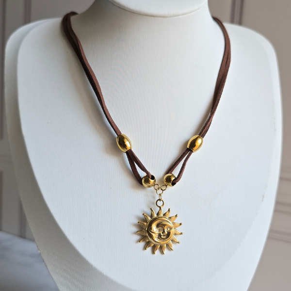 Choker Sol con cadena de tipo cuero parecido a la gamuza en color café.