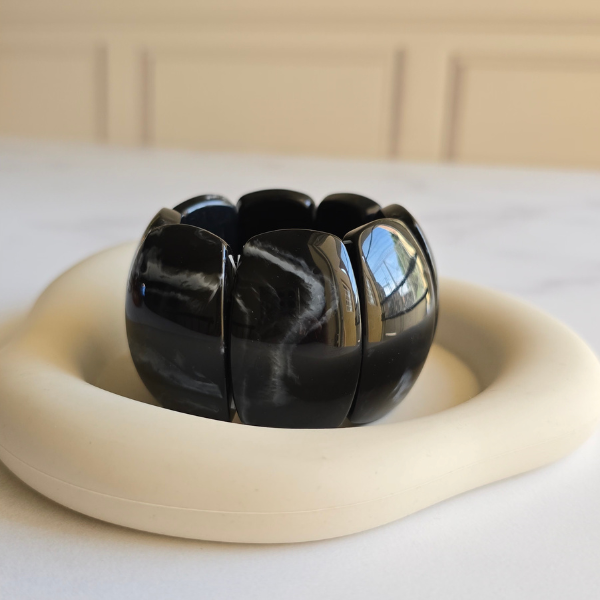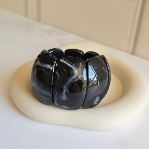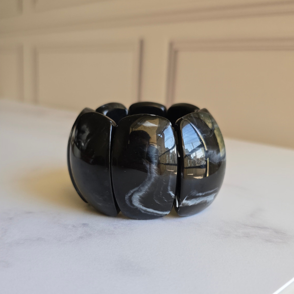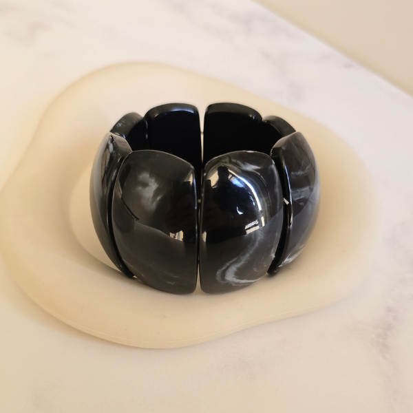 Pulsera oruga negro marmoleado, se adapta super bien a una muñeca delgada ya que es de resorte